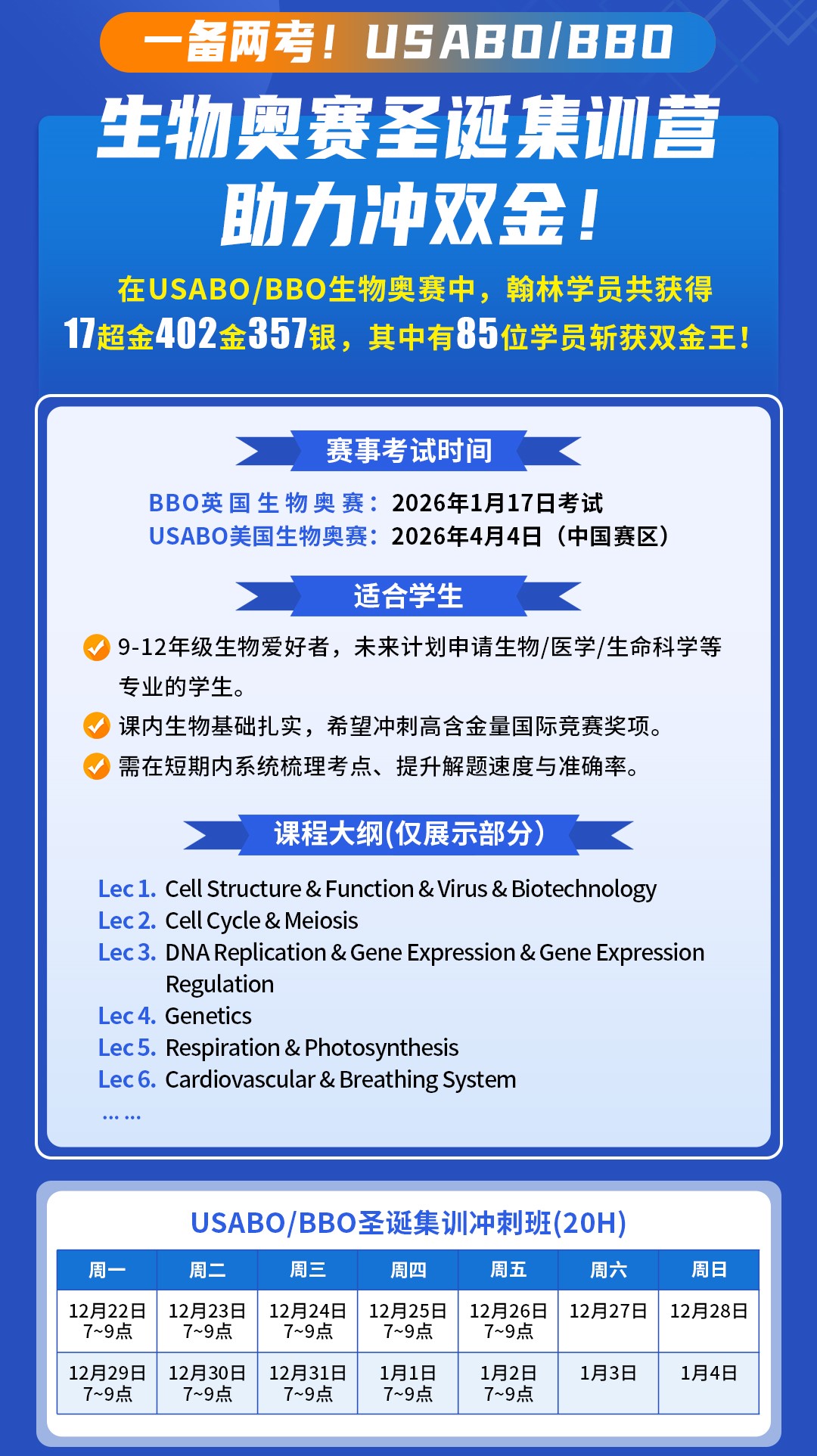 USABO是IBO之下各类国际性生物竞赛中难度最高的,从考察的深度和广度上都要超过本身已经比较难的AP生物,要求对知识点的深度理解和掌握并能够灵活运用。课程以权威的Campbell生物学为基础,内容安排上以USABO为参照,在教授大学水平的生物学内容的同时,也尽可能的培养生物思维和高水平生物竞赛所需的解题思路。该课程不仅有助于在USABO中拿奖,有可以帮助在AP生物学,BBO,多伦多生物竞赛, SAT2生物考试中取得高分。
